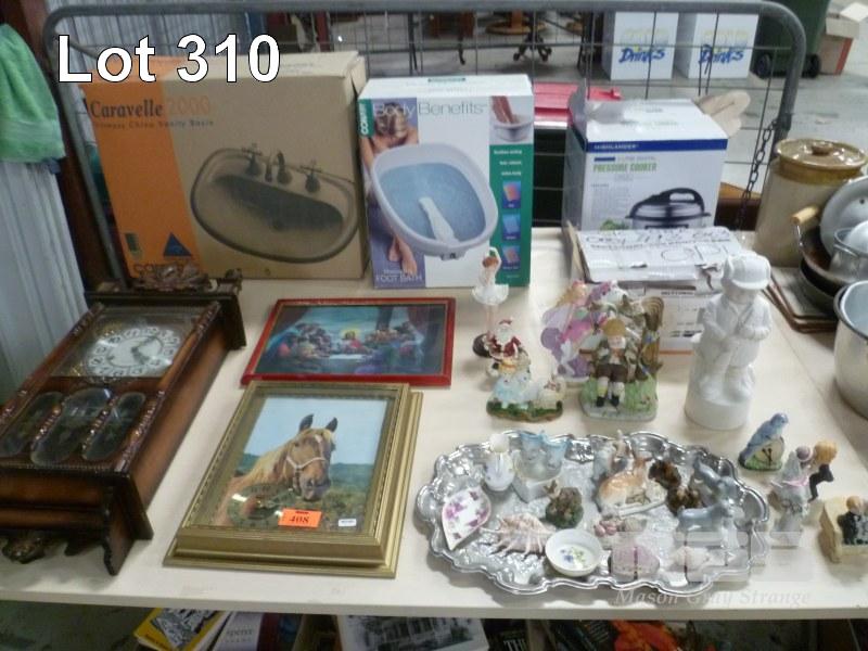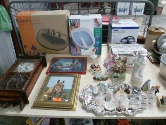2 x WALL CLOCKS, PRESSURE COOKER, FOOT PSA, SECTIONAL DOOR MOTOR, ASSORTED ORNAMENTS, ETC, 1 x TABLE