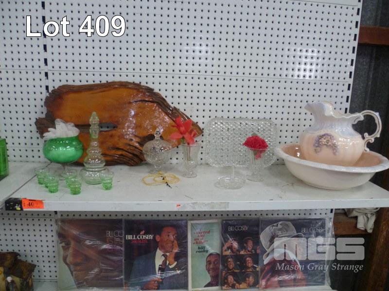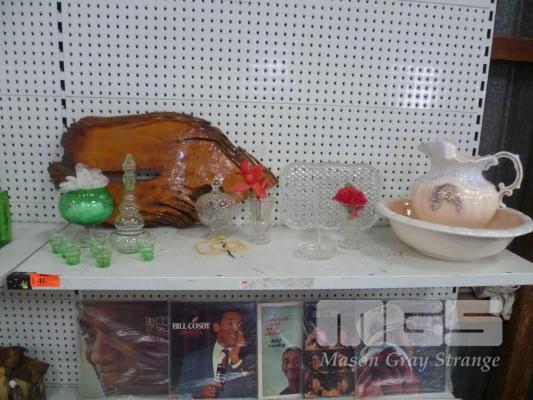 CERAMIC JUG & BOWL SET, GREEN GLASS DECANTER, TIMBER WALL ART, ETC