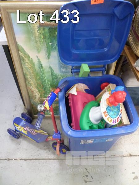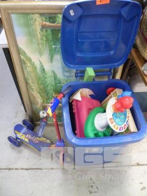 BLUE TIDY BIN WITH CHILDRENS TOYS & FRAMED PAINTING