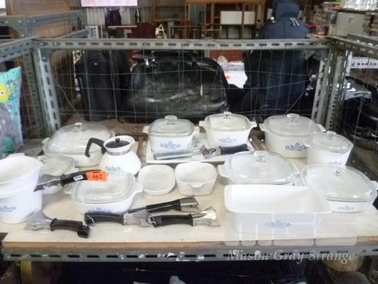 CORNINGWARE COLLECTION, BLUE & WHITE WITH DETACHABLE HANDLES