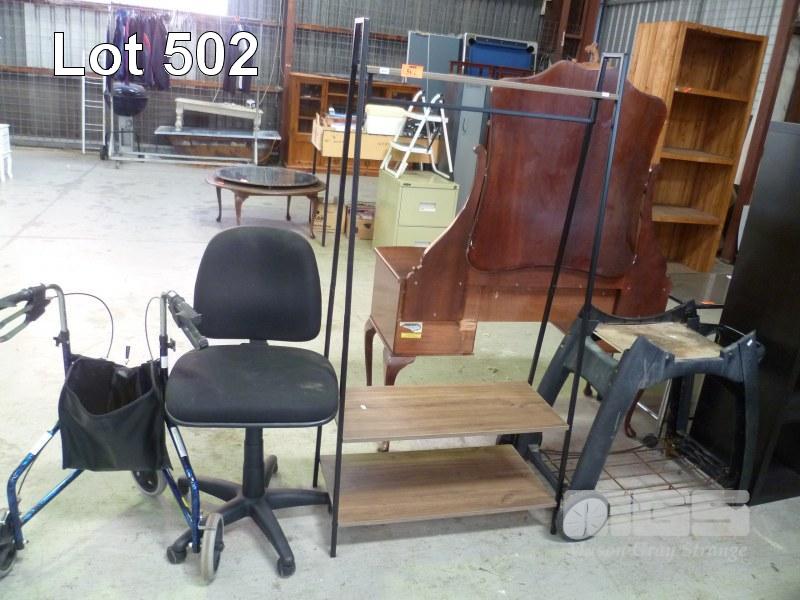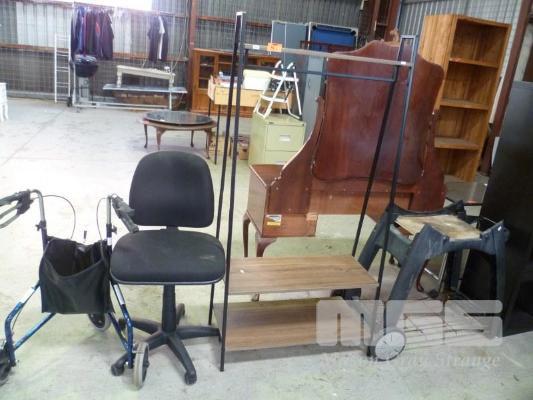 3 WHEEL BLUE MOBILITY WALKER, OFFICE CHAIR, CLOTHES RACK & WEBER BBQ STAND