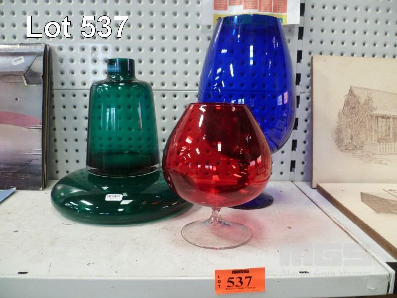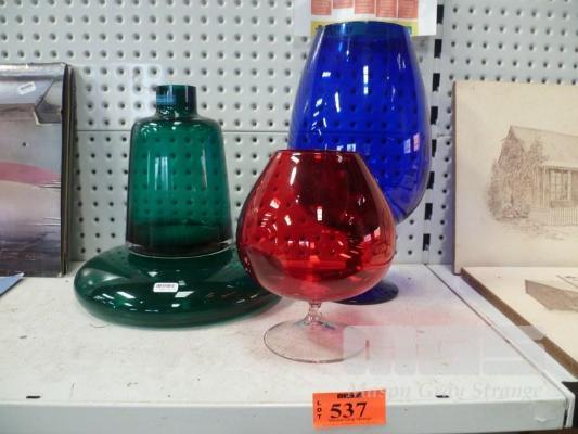 ART GLASS INC LARGE BRISTLE BLUE VASE, RED VASE & 2 PIECE GREEN GLASS VASE