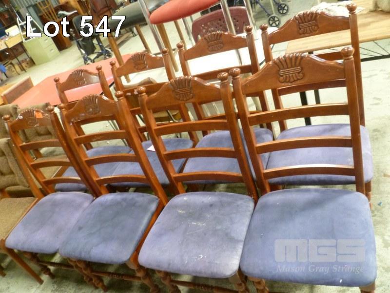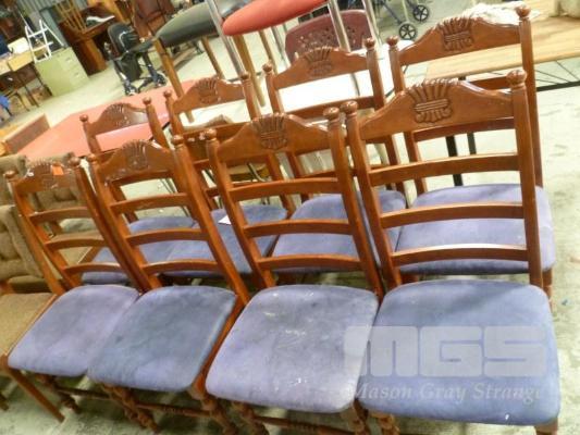 SET OF 8 TIMBER DINING CHAIRS, SLAT BACK, BLUE MICROFIBRE FABRIC (SEATS REQUIRE CLEANING)