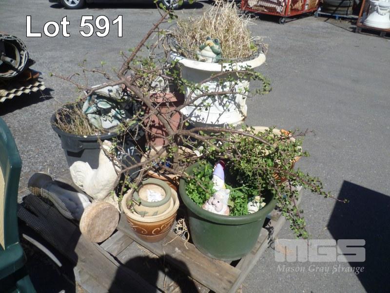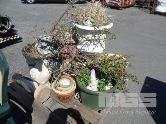 ASSORTED POTTED PLANTS, GARDEN POTS & GARDEN ORNAMENTS