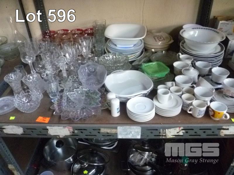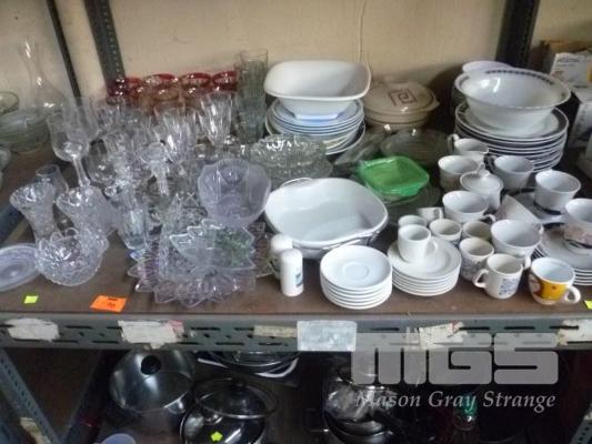 ASSORTED CRYSTALWARE, CUT GLASS, CERAMIC PART DINNER SERVICE, ETC, 1 x SHELF