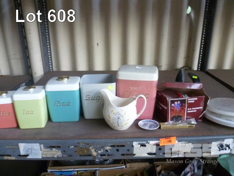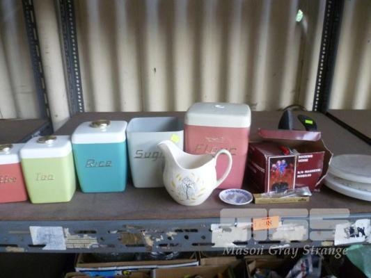 SET GRADUATED VINTAGE CANISTERS, (1 x MISSING LID), CERAMIC JUG, WALL CLOCKS, ETC