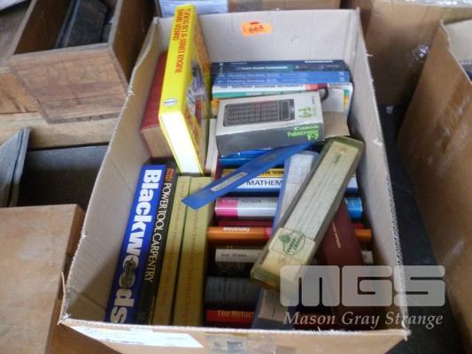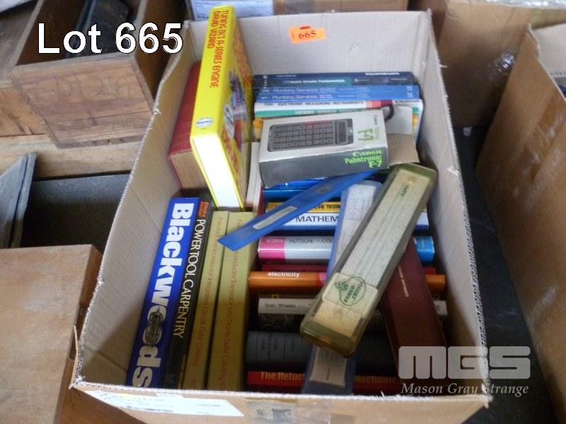 BOX OF TECHNICAL BOOKS, WORKSHOP MANUALS AND CATALOGUES. INCLUDE SLIDE RULES AND VINTAGE CANNON F-7 "PALMTRONIC" CALCULATOR