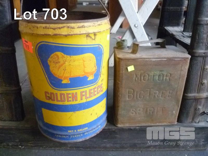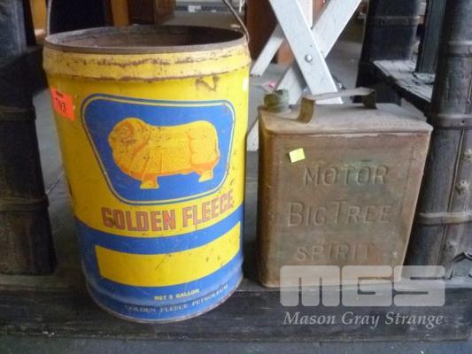 PETROLIANA. 2 x VINTAGE PETROL CANS: GOLDEN FLEECE "NET 5 GALLON" CAN AND "BIG TREE MOTOR SPIRIT" TWO GALLON CAN.PETROLIANA.