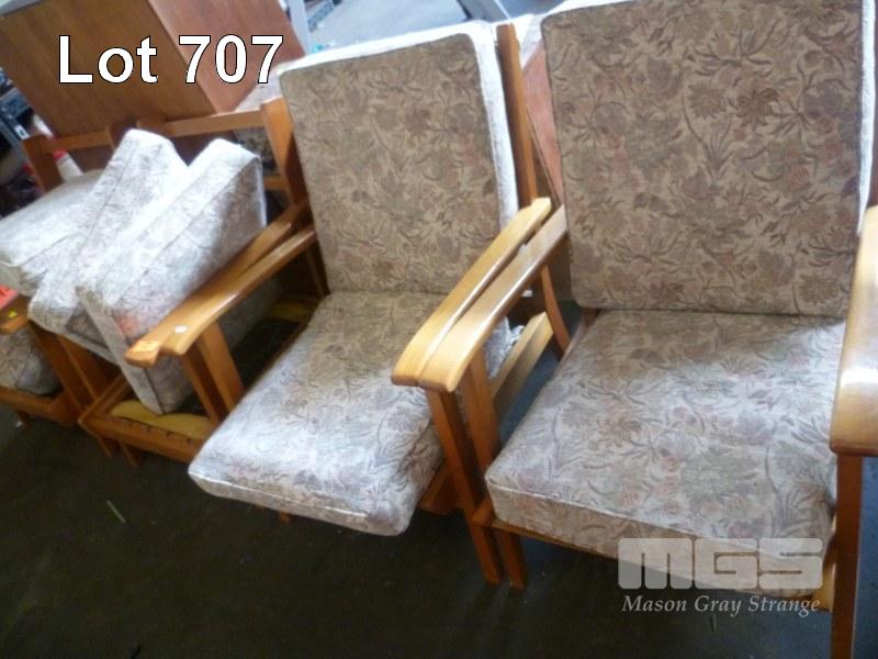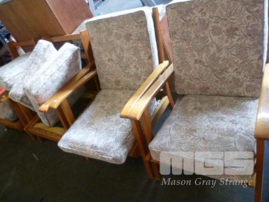 4 x WOODEN SPRING BASE ARM CHAIRS AND CUSHIONS