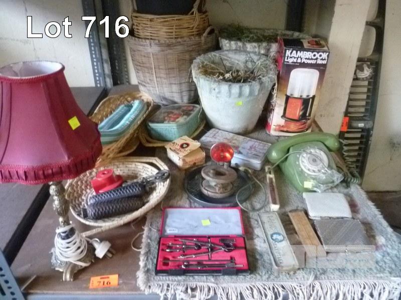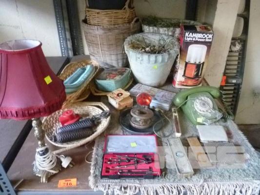 SORTED VINTAGE HOMEWARES INCLUDING DIAL TELEPHONE, TINS, PRO MESH PURSES, WOODEN FISHING REEL, CUCKOO CLOCK WINDING WEIGHTS, BRASS TABLE LAMP, CANE BASKETS, PLANTER POTS AND MORE