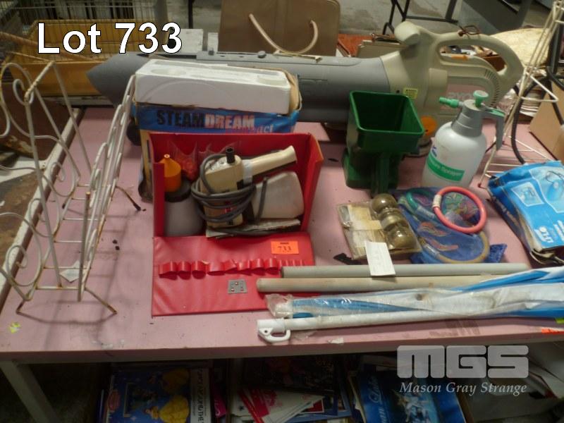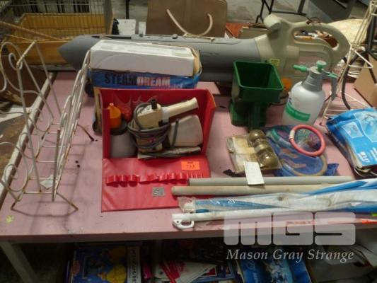 RYOBI BLOWER VAC, SPRAY GUN, MAGAZINE RACK, ETC (1 X TABLE)
