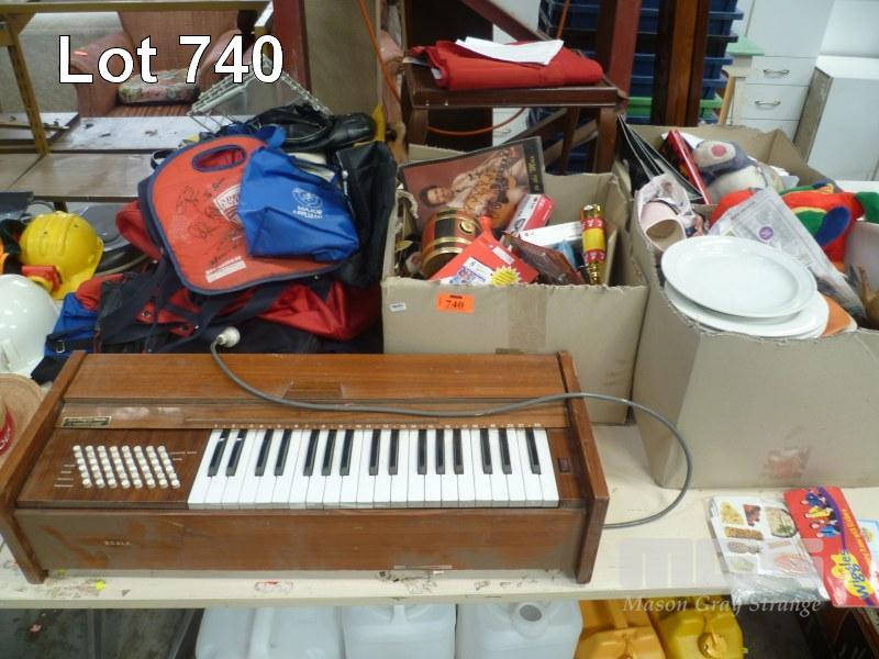 SCALA ELECTRIC KEYBOARD, CARRY BAGS, CROCKERY, TOYS, ETC, 1 x TABLE