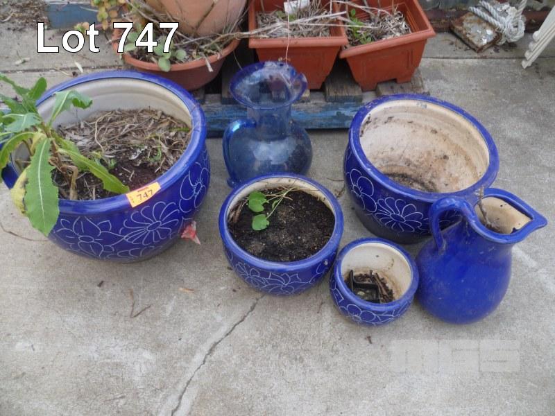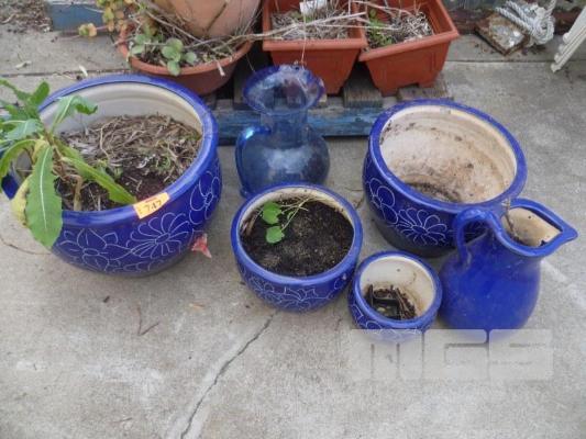 4 X GLAZED BLUE GARDEN POTS & 2 X BLUE JUGS