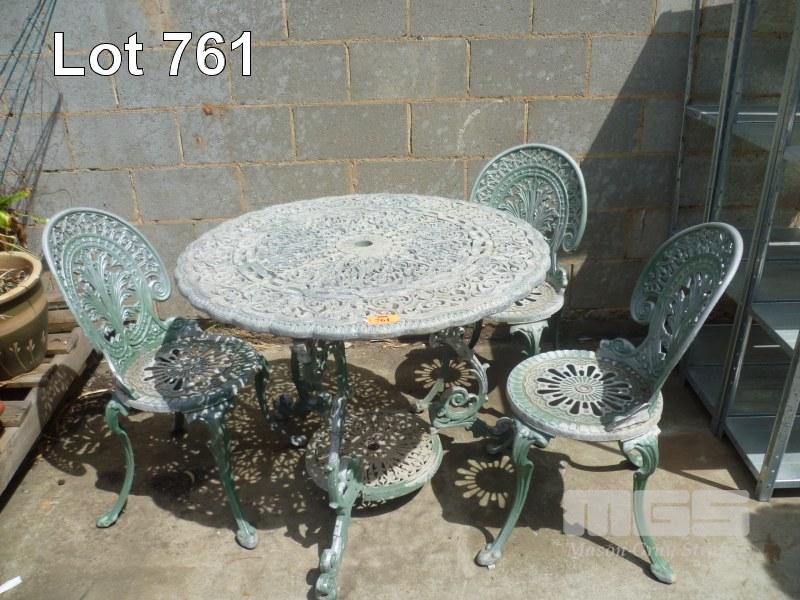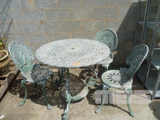 GREEN PAINTED, CAST ALUMINIUM, 4 PIECE OUTDOOR SETTING, IN; ROUND TABLE & 3 X CHAIRS