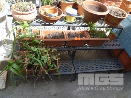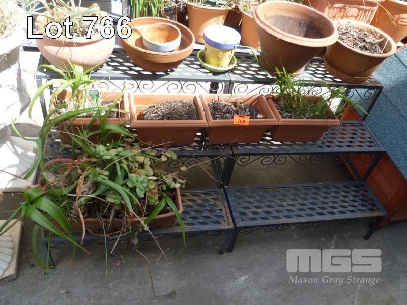 PAIR OF STEPPED PLANTER STANDS WITH POTTED PLANTS