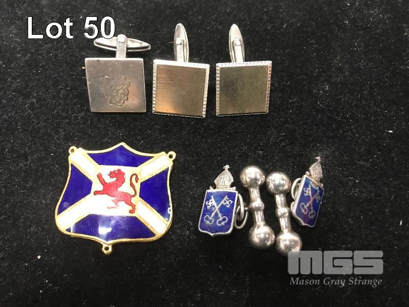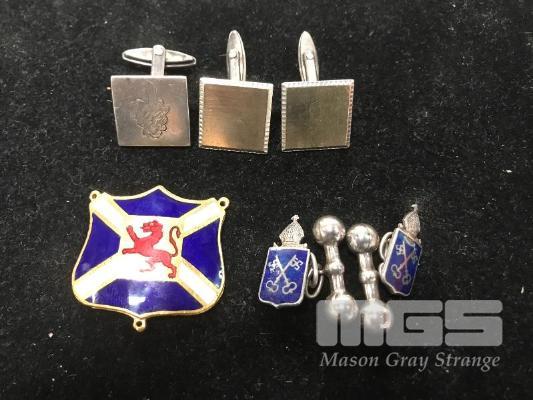 SET OF BLUE STERLING SILVER CUFFLINKS, ENAMEL SHIELD SINGLE STERLING CUFFLINK & PAIR OF UNMARKED CUFFLINKS