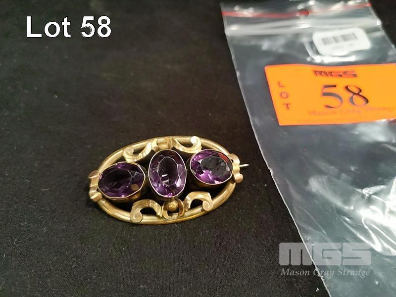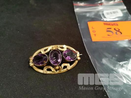 VINTAGE AMETHYST BROOCH IN GOLD SETTING (UNMARKED), 3 LARGE AMETHYST
