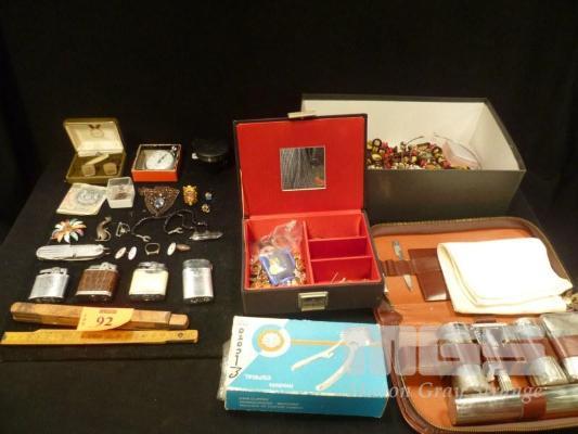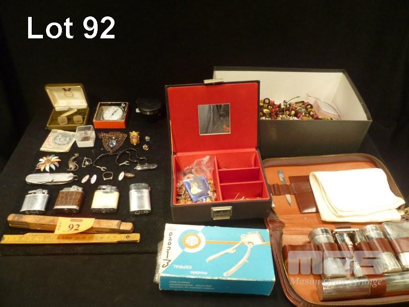 ASSORTED DRESS JEWELLERY & CURIOS INC CIGARETTE LIGHTERS, GENTLEMAN'S BATHROOM SET (IN-COMPLETE), HAIR CLIPPERS, STOP WATCH, ETC