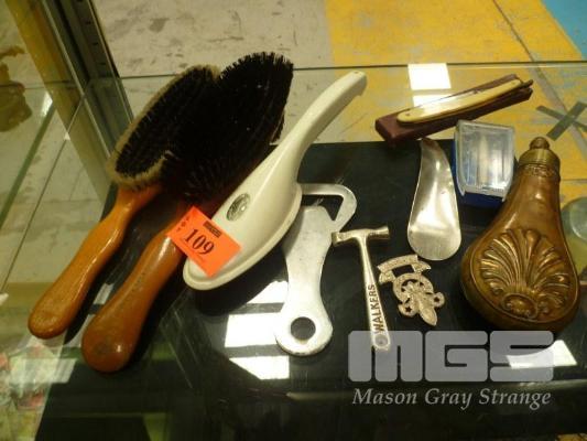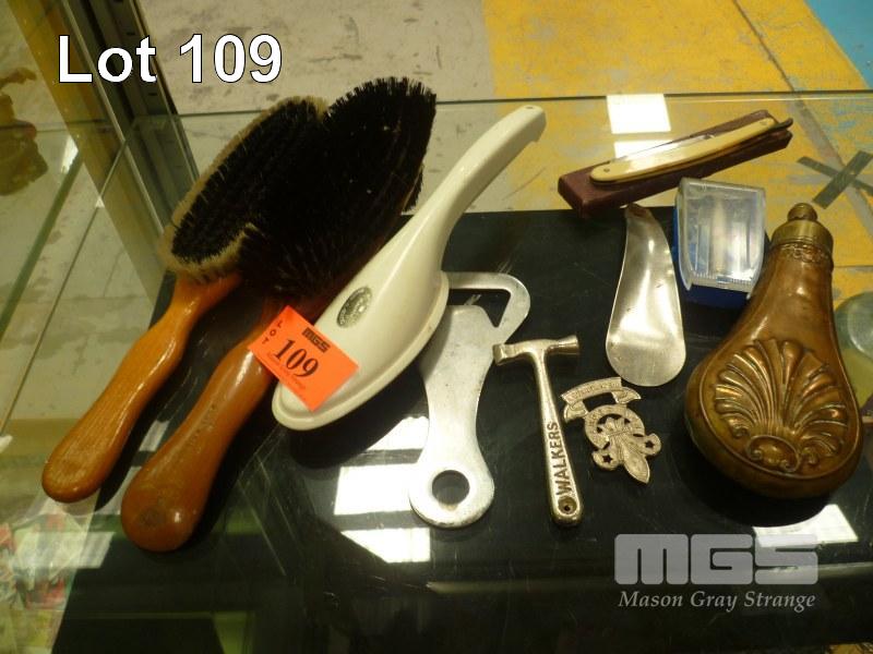 VINTAGE GUNPOWDER FLASK, CUT THROAT RAZOR, BRUSHERS, BOTLLE OPEN, SHOE HORN, ETC