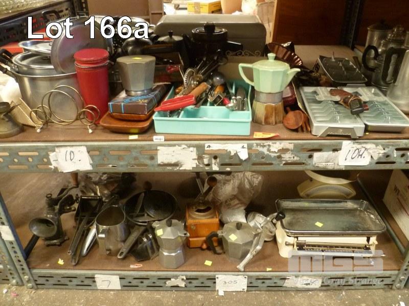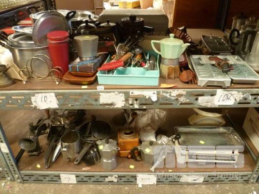 COFFEE POTS, ANODISED CUPS, COFFEE GRINDER, UTENSILS, SCALES, ETC, 2 x SHELVES