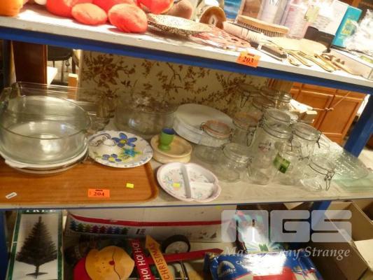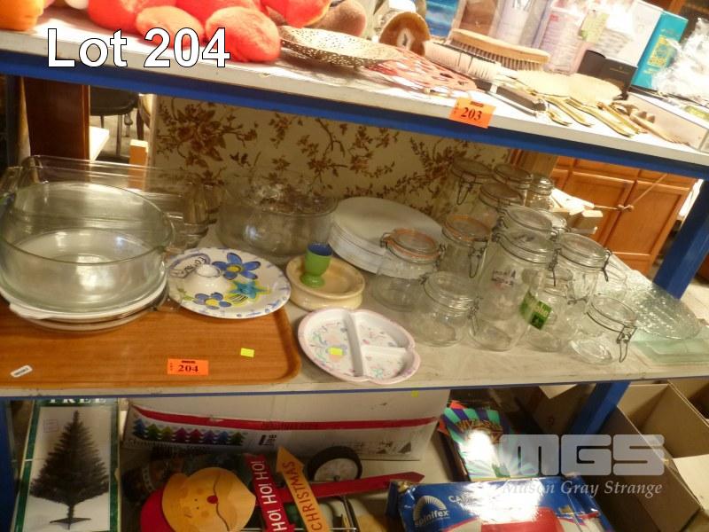 ASSORTED GLASS JARS, DINNERWARE, BOWLS, COOKWARE, ETC