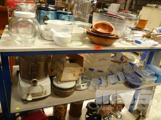 ASSORTED KITCHENWARE, COOKWARE, PLASTIC CONTAINERS, BOWLS, ETC, 2 x SHELVES