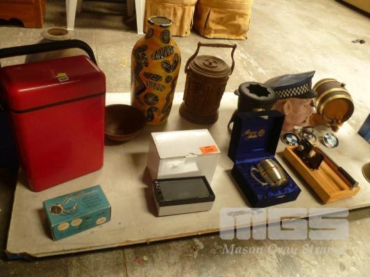 SMALL PORT KEG, MONEY BOX, VASES, PEWTER MUG, ETC