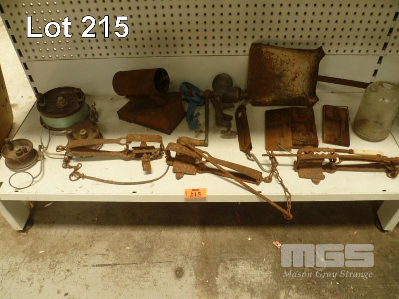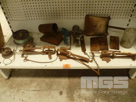 RUSTIC FARM WARES INC 3 x ALVERY BAKELITE FISHING REELS, RABBIT TRAPS, ETC
