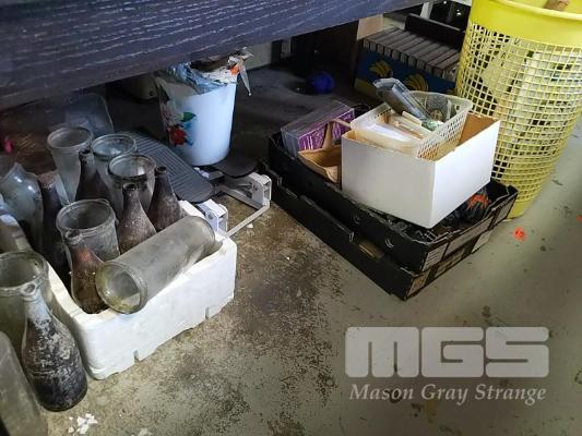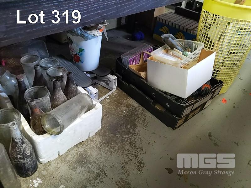 UNSORTED LOT OF COLLECTIBLE BOTTLES, PRESERVING JARS, LEGO AND VINTAGE ELECTRICAL ( SECTION UNDER TABLE)