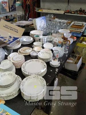 ASSORTED DINNERWARE, GLASSWARE, PICTURE FRAMES, ETC