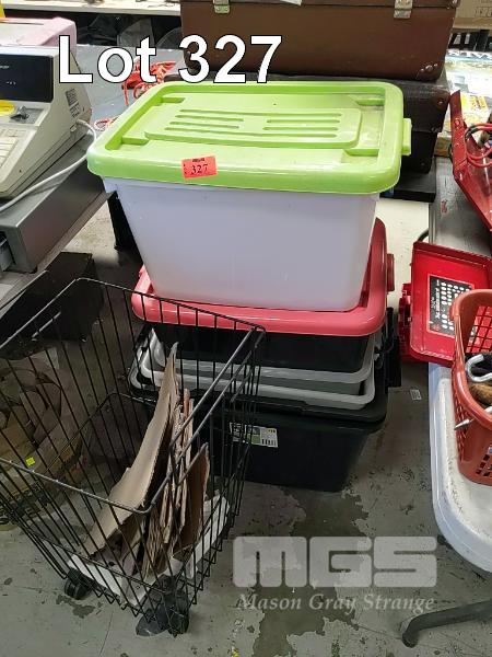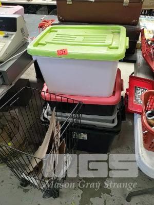 ASSORTED PLASTIC TUBS AND MOBILE WIRE BASKET