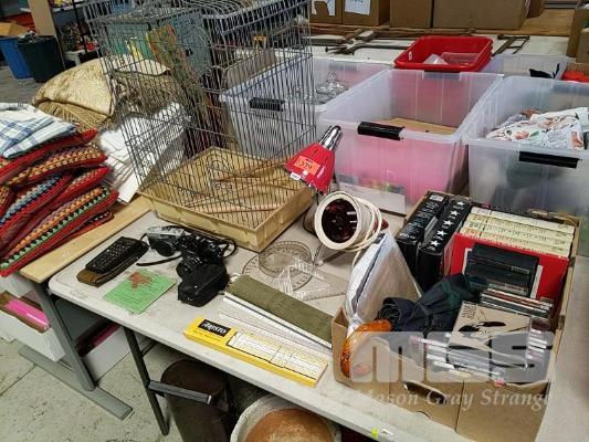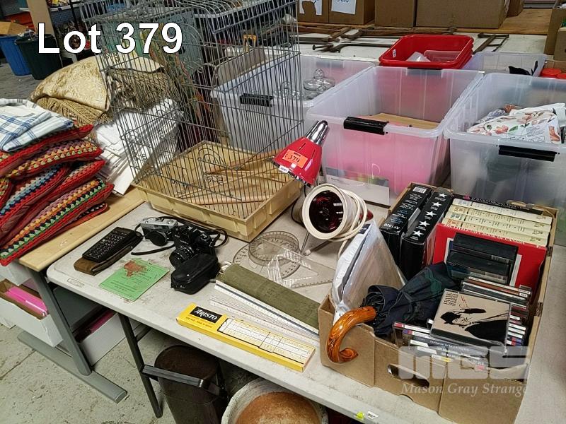 ASSORTED CD'S, LAMPS, YASHICA CAMERA, BIRD CAGE, RULERS, ETC