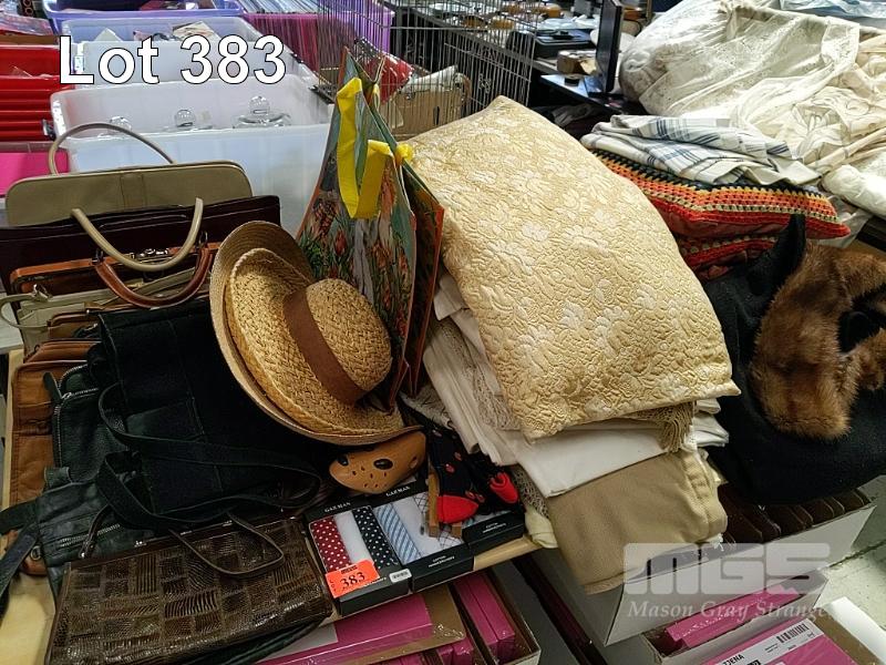 ASSORTED HANDBAGS, MANCHESTER, CUSHIONS, ETC, 1 x TABLE