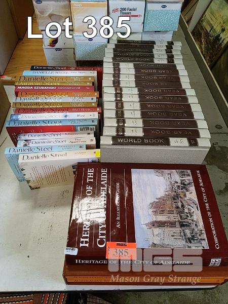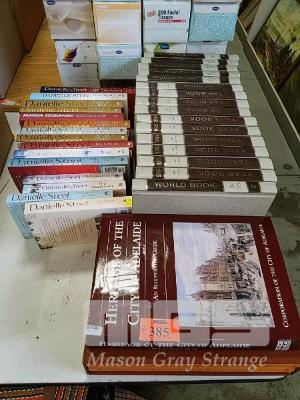 COLLECTION OF BOOKS AND NOVELS INCLUDING DANIEL STEEL NOVELS, WORLD BOOK ENCYCLOPAEDIA, HERITAGE OF THE CITY OF ADELAIDE AND AUSTRALIA'S BALDNESS HERITAGE.