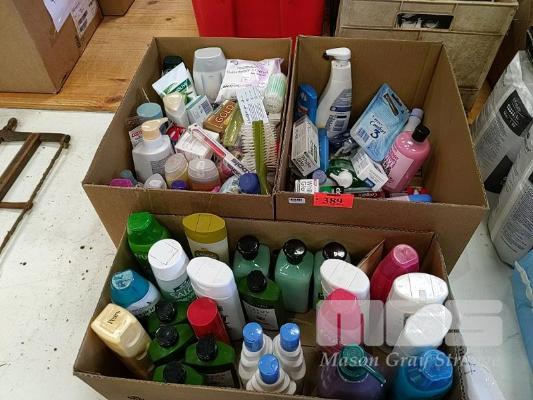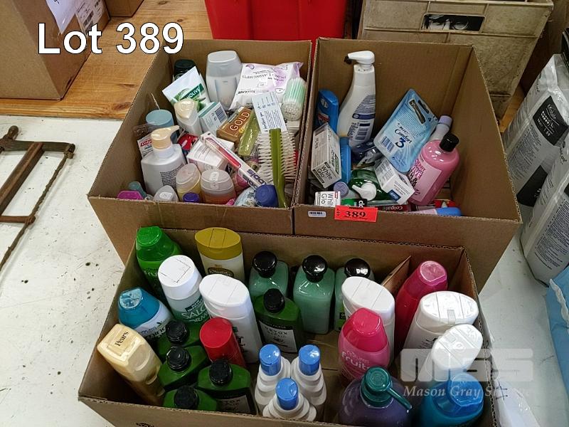 A COLLECTION OF SHAMPOOS AND CONDITIONERS AND OTHER HOME BATHROOM SUPPLIES (3 x BOXES)