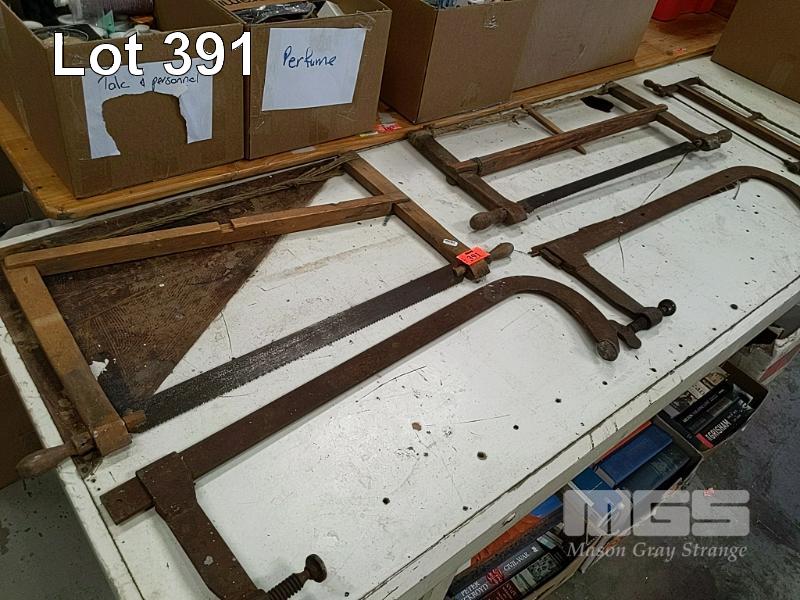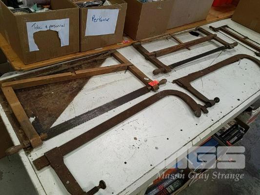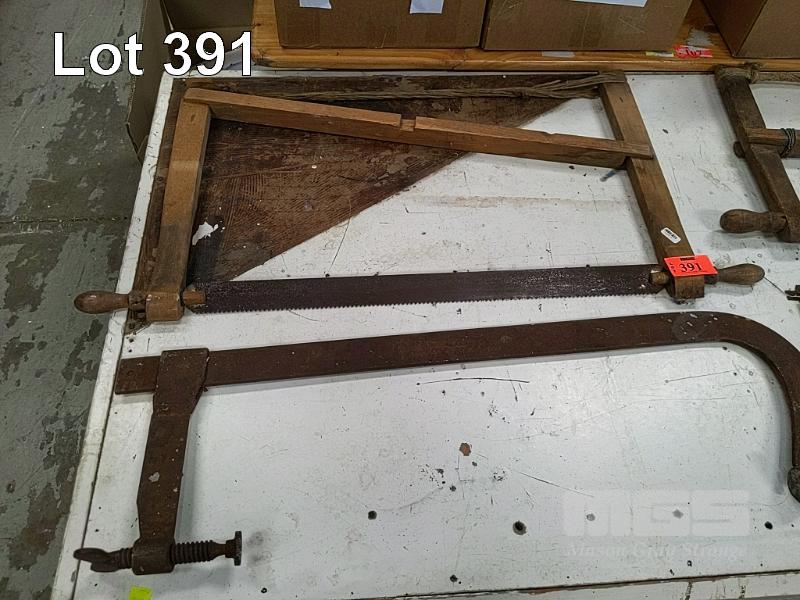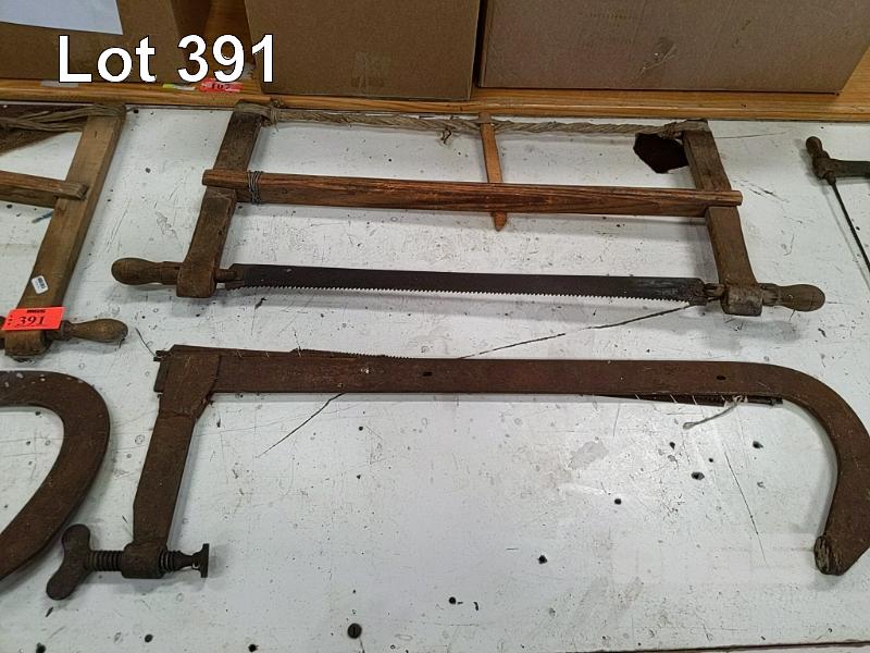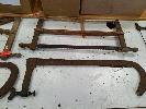 3 x VINTAGE CARPENTERS SAWS & 2 x LARGE G-CLAMPS