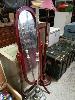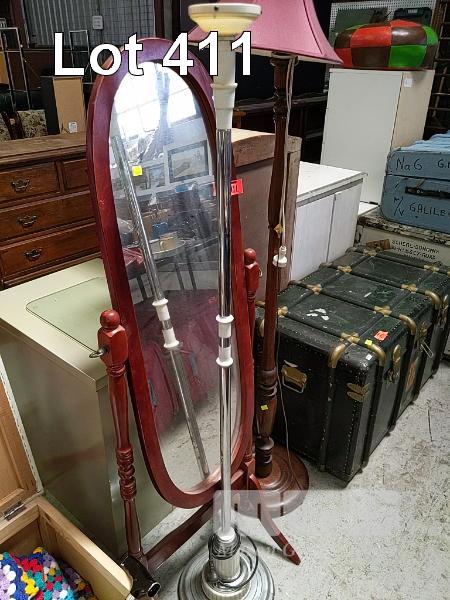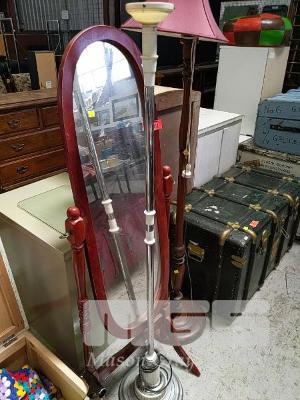TIMBER FRAME CHEVAL MIRROR & 2 x STANDARD LAMPS, (SHADES MISSING & DAMAGED)
