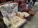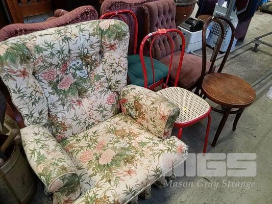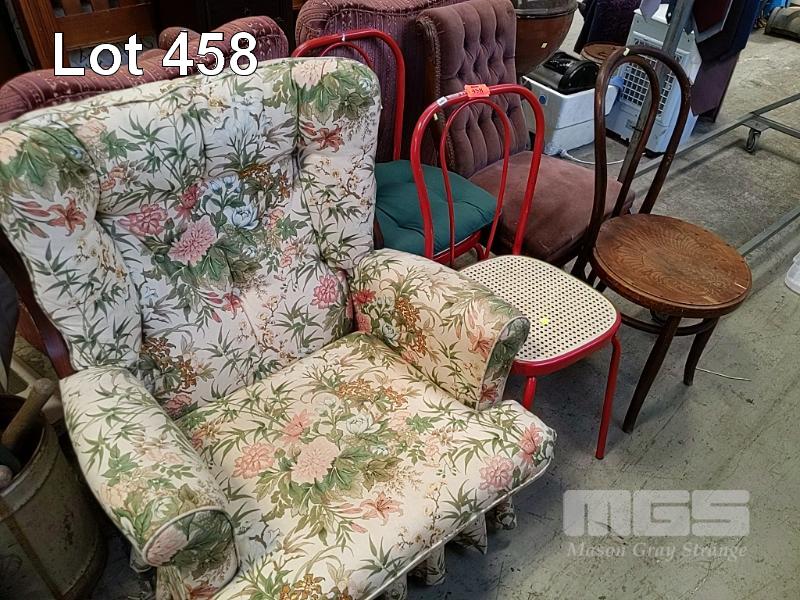 FLORAL FABRIC ARM CHAIR, WING BACK, 2 x RED METAL FRAME DINING CHAIRS, VINTAGE BENTWOOD DINING CHAIR, ETC