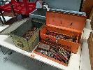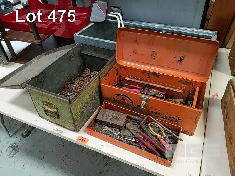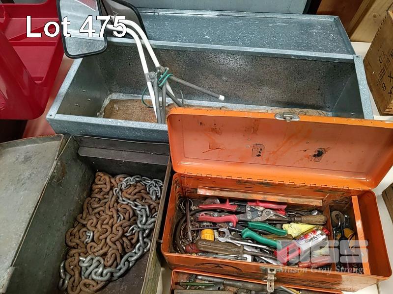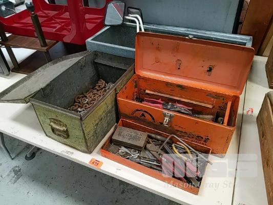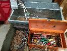 LARGE GALV TOOL CHEST, CHAINS, & RAMSET TOOL BOX & CONTENTS OF RUSTIC TOOLS