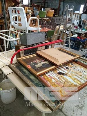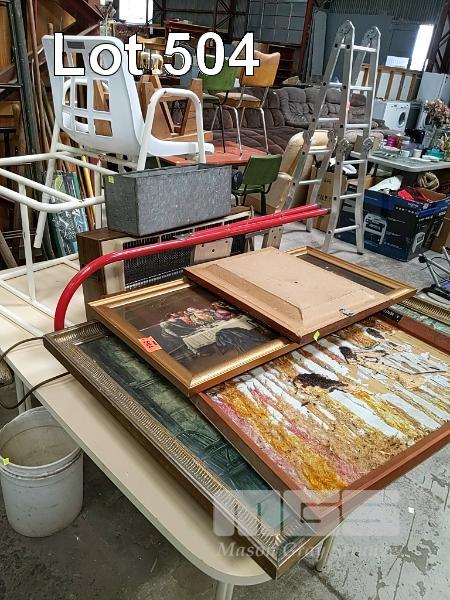 ASSORTED PRINTS, PAINTINGS, OTHER ARTWORKS AND DISABILITY CHAIR, FRAME, BAR RADIATOR (1 x TABLE)