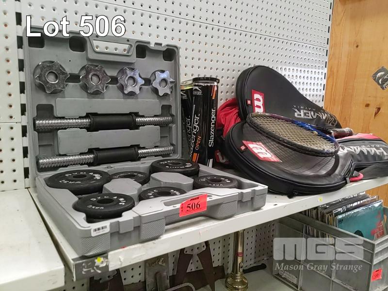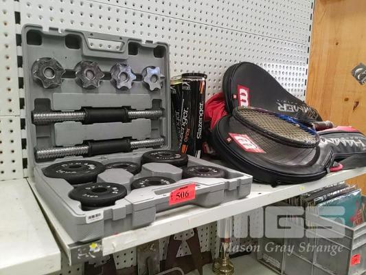 DYNAMIC WEIGHTS SET, TENNIS BAG, TENNIS BALLS, 3 x TENNIS RACQUETS INC 2 x WILSON HAMMER TOUR & FISCHER