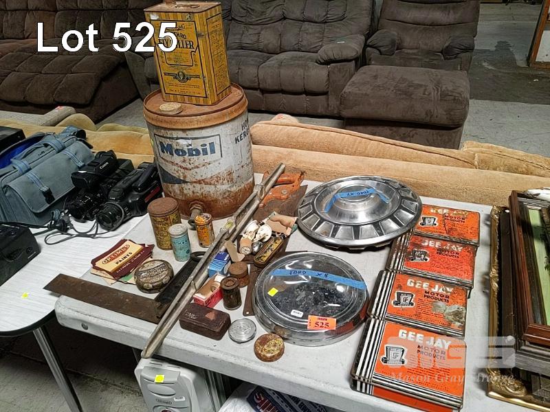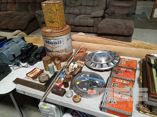 COLLECTION OF VINTAGE TINS, CANS, TOOLS AND OTHER VINTAGE CURIOSITIES