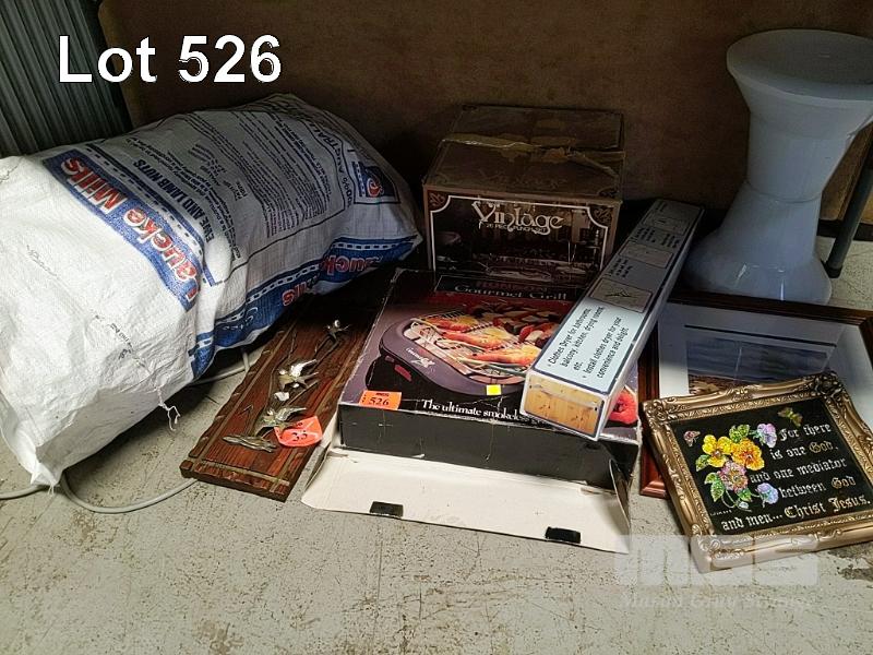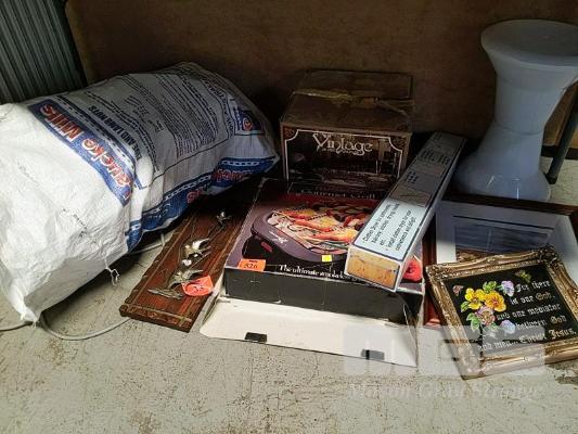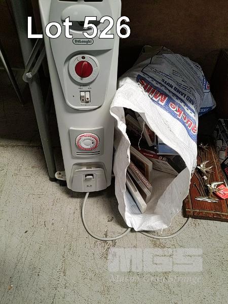 COLLECTION ASSORTED GOODS INCLUDING DELONGHI OIL HEATER, RONSON GRILL, FRAMED PHOTOGRAPHS, BAG OF UNSORTED DVDS ETC (CONTENTS UNDER TABLE)