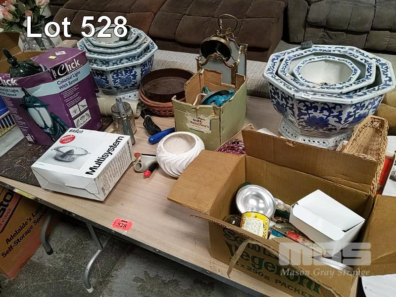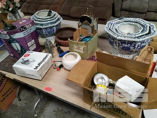 ORIENTAL STYLE NESTED POTS, LAMP SHADES, VINTAGE ELECTRICAL ETC (1 x TABLE)