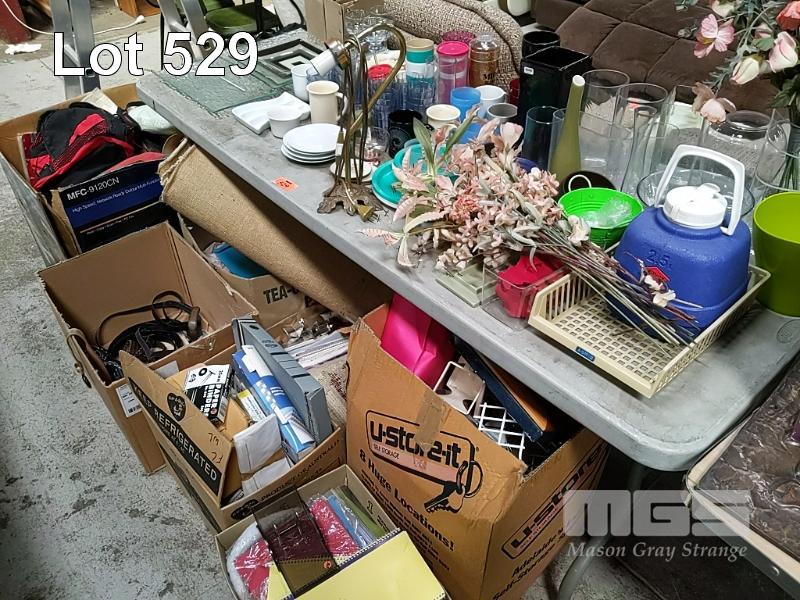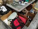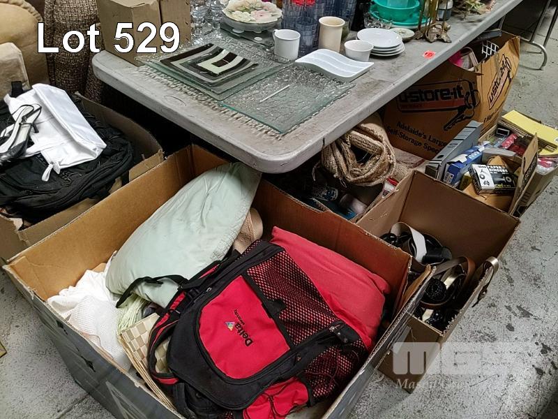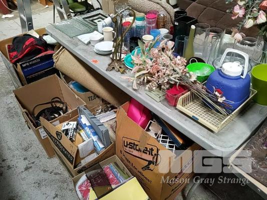 LARGE COLLECTION OF HOMEWARES, FLOOR RUGS, BAGS, BELTS, HOME OFFICE SUPPLIES, VASES, PLATTER ETC. (1 x TABLE AND BOXES UNDER)
