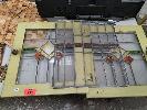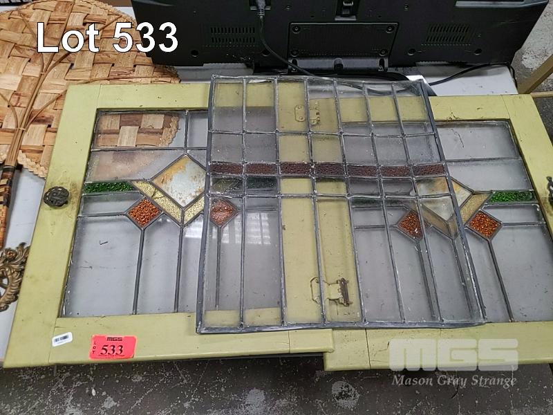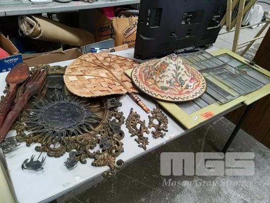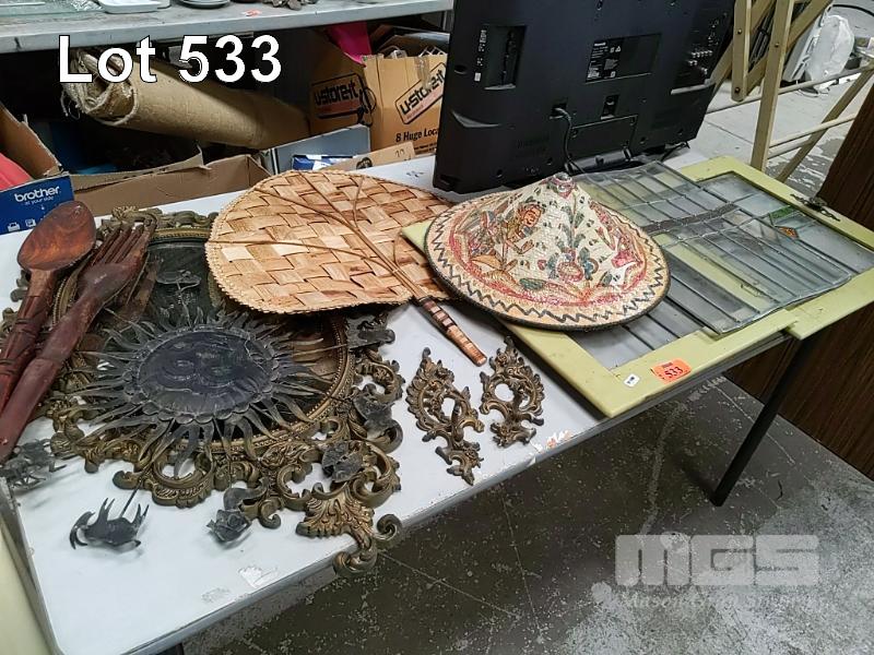 VINTAGE STAINED GLASS CABINET DOORS, CHINA HAT AND FAN, BAROQUE WALL MIRROR & WALL HOOKS, SUN WALL HANGINGS ETC