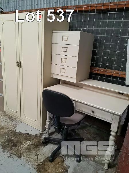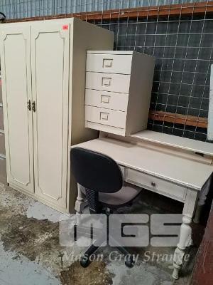 2-TWO-DOOR CUPBOARD, 4-DRAWER BEDSIDE TABLE, 2-DRAWER WRITING DESK WITH SHELF AND GAS LIFT CHAIR