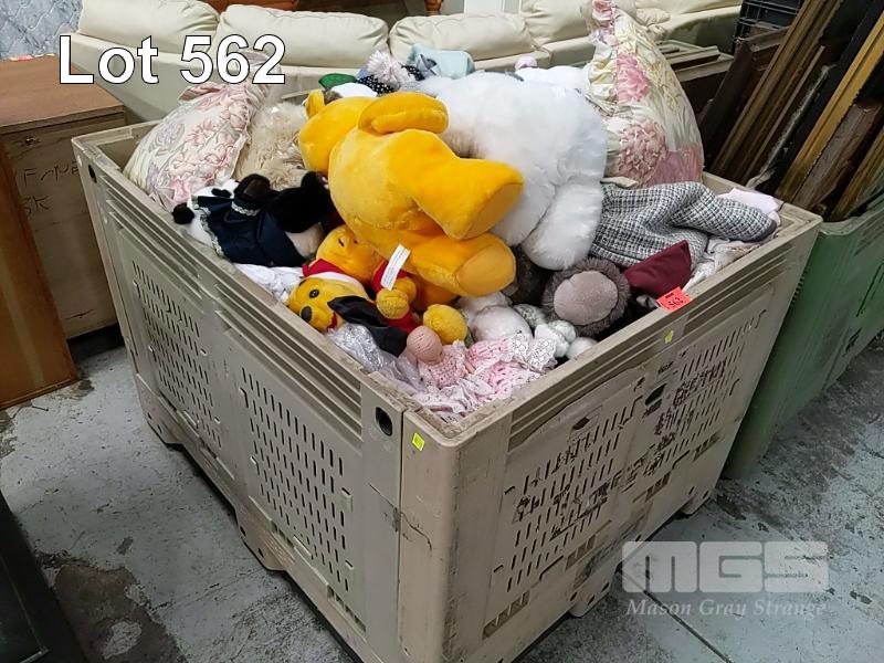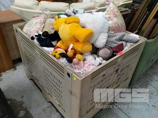 LARGE COLLECTION OF HOUSEHOLD LINEN, PLUSH TOYS AND CLOTHING (1 x BIN NOT INCLUDED)