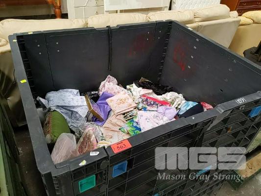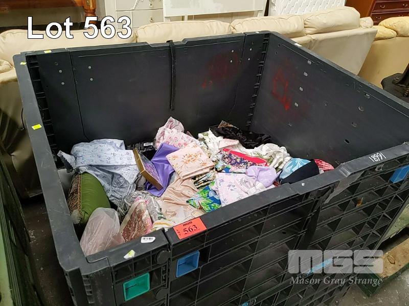 VERY LARGE COLLECTION OF HOUSEHOLD LINEN, CLOTHING, BEDDING, CUSHIONS, OLD TEA TOWELS, UNDERWEAR, TABLECLOTHS, DOILIES AND MUCH MORE. MOSTLY WOMEN'S CLOTHING, MUCH OF THE CLOTHING AND BEDDING IS NEW IN PACKET OR TAGS STILL ON (1 x CRATE - NOT INCLUDED)