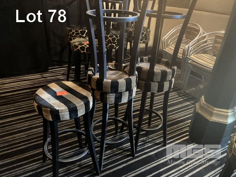 5 x BAR STOOLS, STRIPED FABRIC, TIMBER FRAME